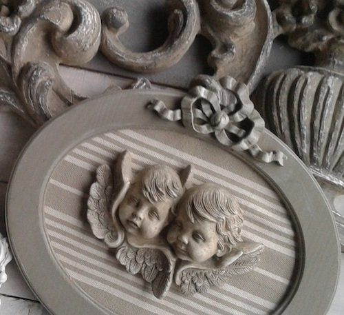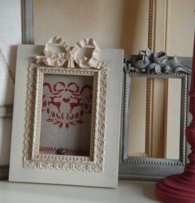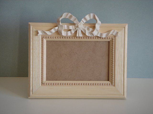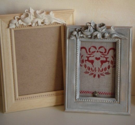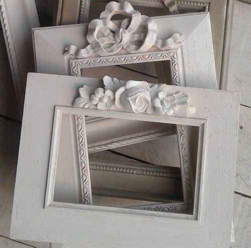 Les cadres en bois brut sont habillés avec différents motifs en résine (fleurs, petits noeuds…). Les cadres et les motifs peuvent être peints avec la même peinture.
